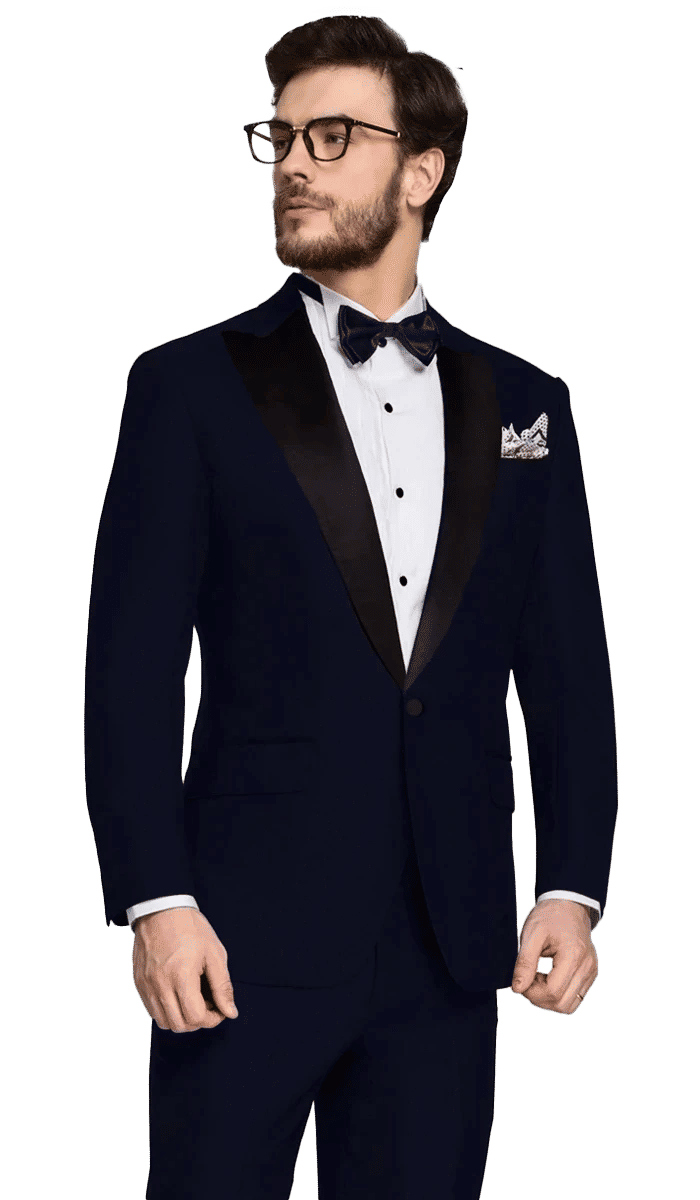 A tuxedo is a formal suit known for its satin details, like on the lapels, buttons, and trouser stripes. It is typically worn for formal events like weddings, galas, and black-tie occasions, paired with a bow tie, dress shirt, and formal shoes.