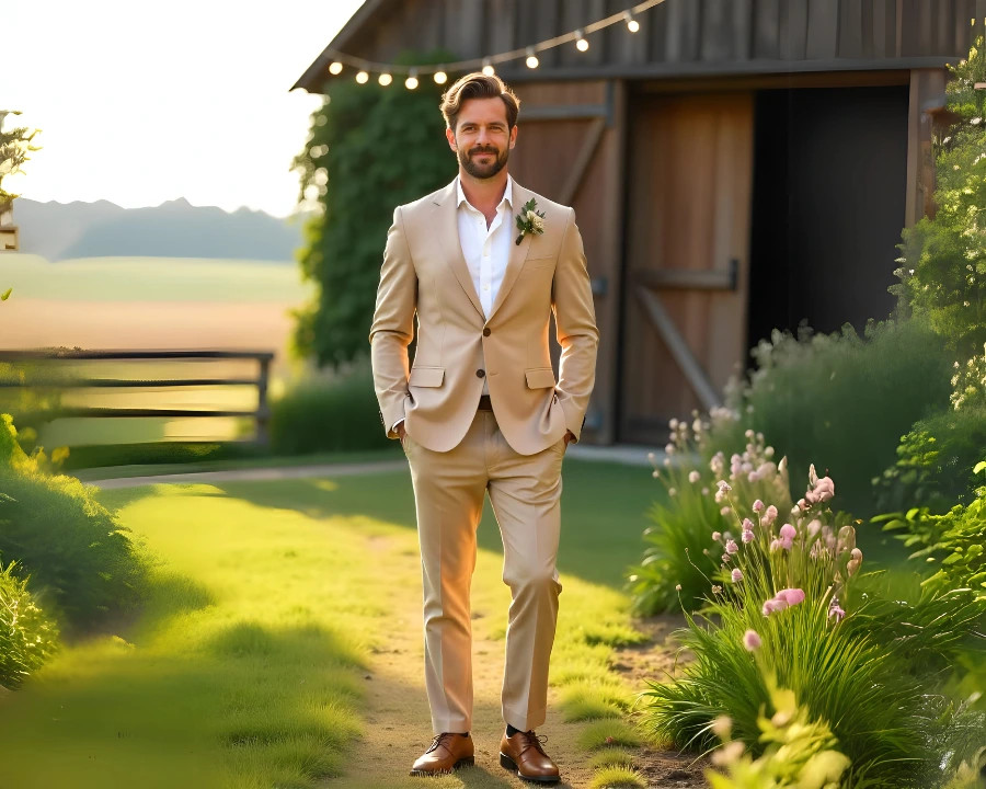 Elegant and versatile, this soft grey linen suit is perfect for grooms who want structure with breathability. Its neutral tone complements pastel florals and golden-hour lighting beautifully. Great for both grooms and groomsmen.