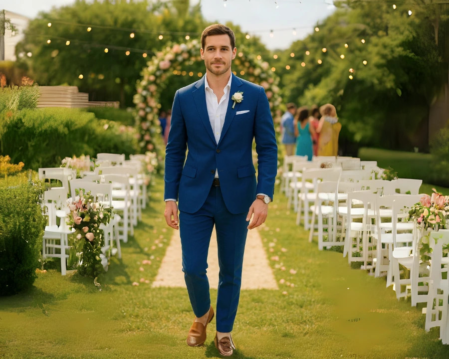Ivory and off-white remain classic choices for grooms. These tones are crisp and timeless, especially when paired with a pale blue shirt or styled all-white with tan loafers. Beige and sand tones are equally elegant and lend a grounded, understated charm—great for groomsmen and laid-back grooms alike. Sky blue and seaside blue bring a refreshing coastal vibe, ideal for sunset or yacht weddings. Earthy greens like sage and olive work beautifully for boho or nature-inspired themes, while dusty rose and blush are perfect for fashion-forward grooms wanting something romantic and a little different.